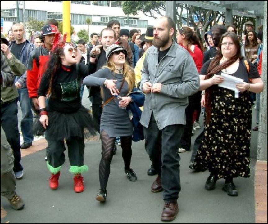 Wellington, 2004. Cale Olsen, remaining characteristically stoic, mobbed and beaten by Leftists. Foreground, left, Val Morse (in grey), peace activist, screams and jeers in her usual histrionic manner. Behind her is John Anderson, another ‘pacifist’ eminence in the anarchist movement.