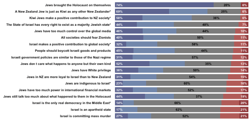 Of the 18 questions asked 7 were placed in the “anti-Israel antisemitism” category. However, anti-Zionist questions were included in the other categories, such as “Jews in NZ are more loyal to Israel than to New Zealand.” This question was categorised as “classical antisemitism.” The question as to whether “Jews are indigenous to Israel” was placed in the “other antisemitism” category.” The other third question in this category asked whether Jews have “white privilege.”